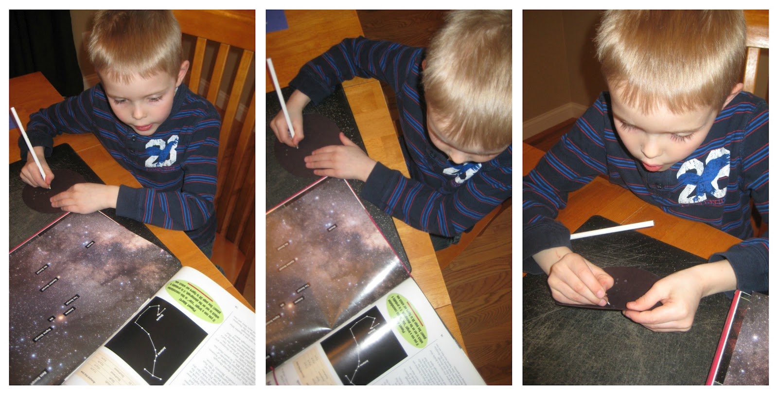 draw constellations on the black circles. Carefully use a pushpin to make holes