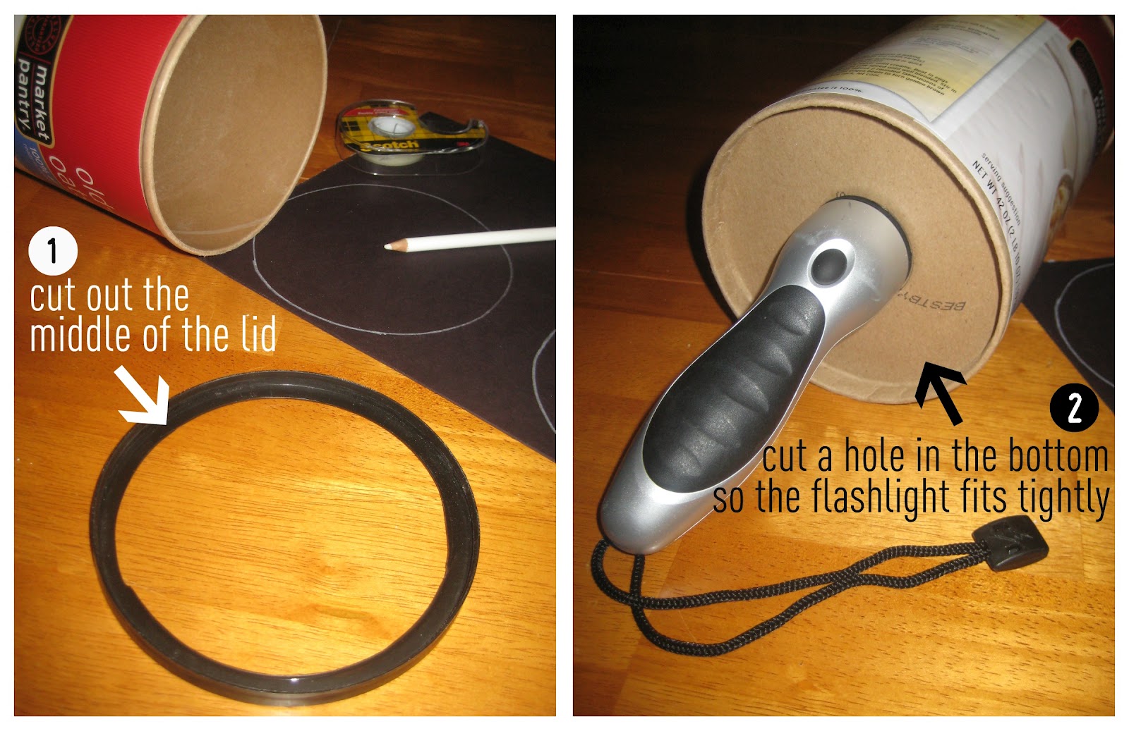 flashlight in the center of the cardboard bottom of the oatmeal container.