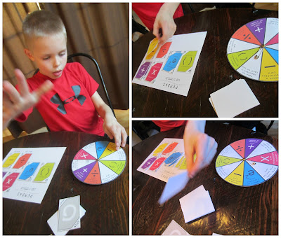 Players take turns drawing cards and placing them on their game board, saying out load, "Parenthesis go first," "Multiplication follows Exponents," etc. If a player already has the card they've just drawn, it goes into a discard pile. If the player draws a SPIN card, they must flick the spinner and follow the directions it points to when it stops moving.